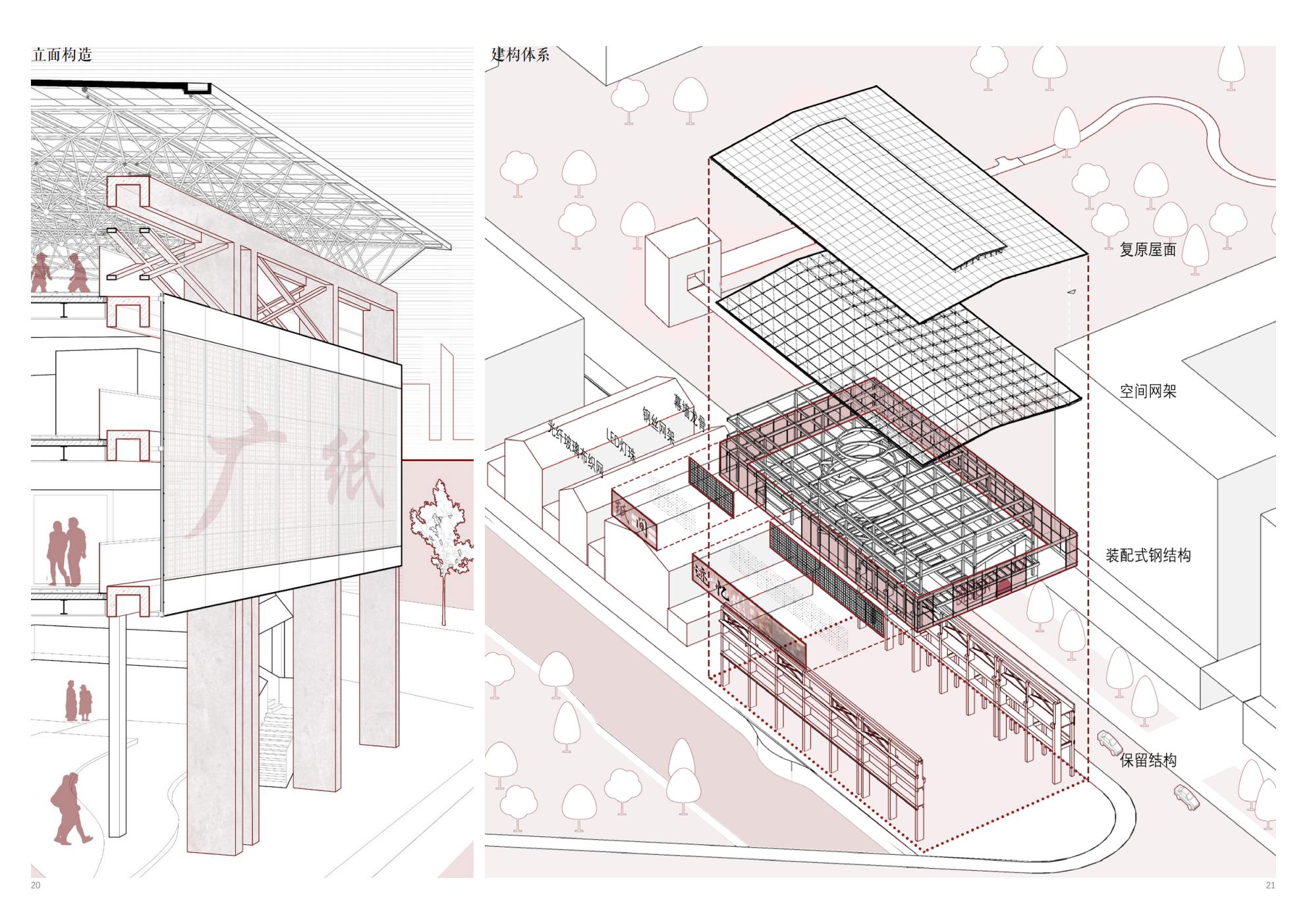 改造后的广纸厂房作为市民中心与办公集成的新型文化综合体,一方面体现广纸片区工业遗存改造的特色;另一方面体现文化建筑的附加效应,同时提升片区的空间、文化、社会效益。